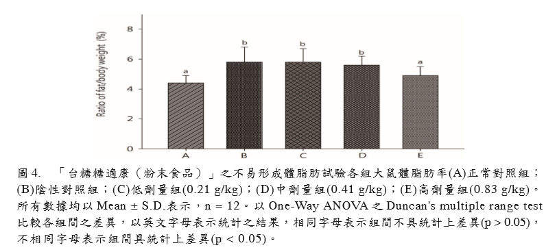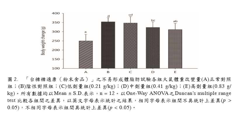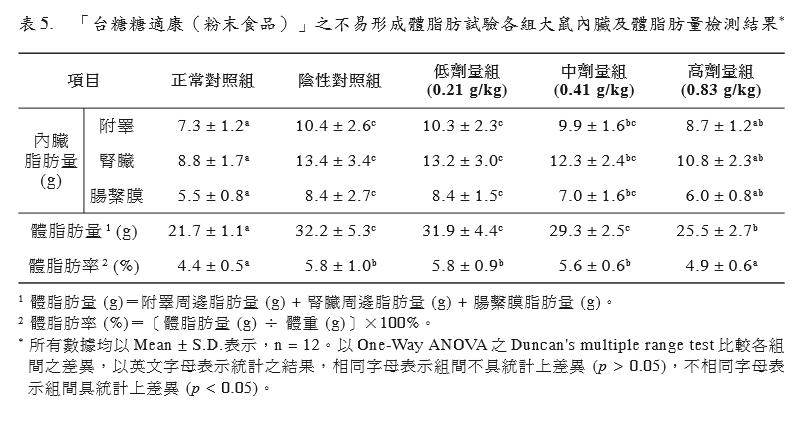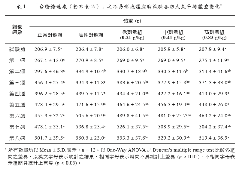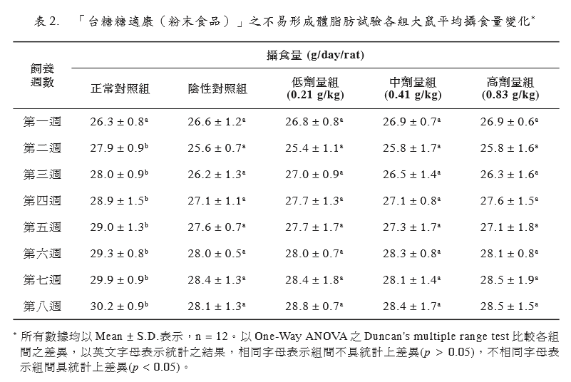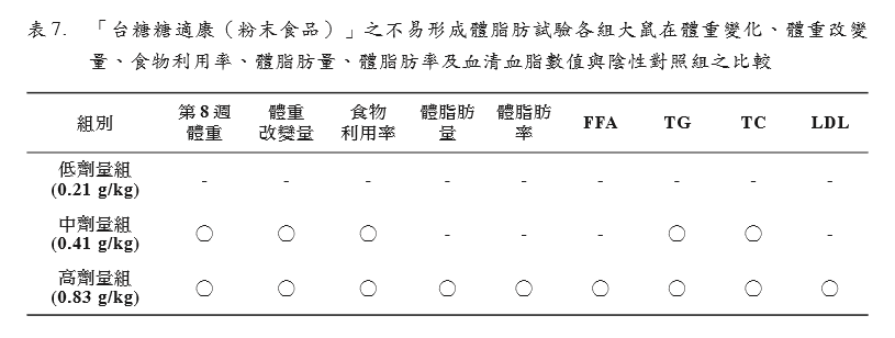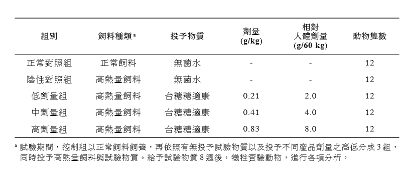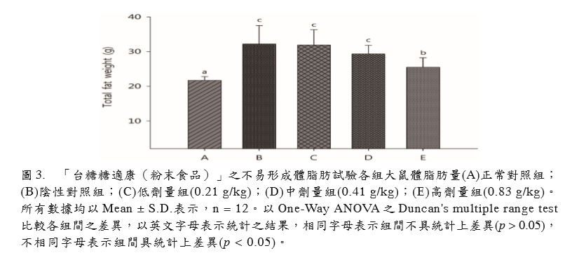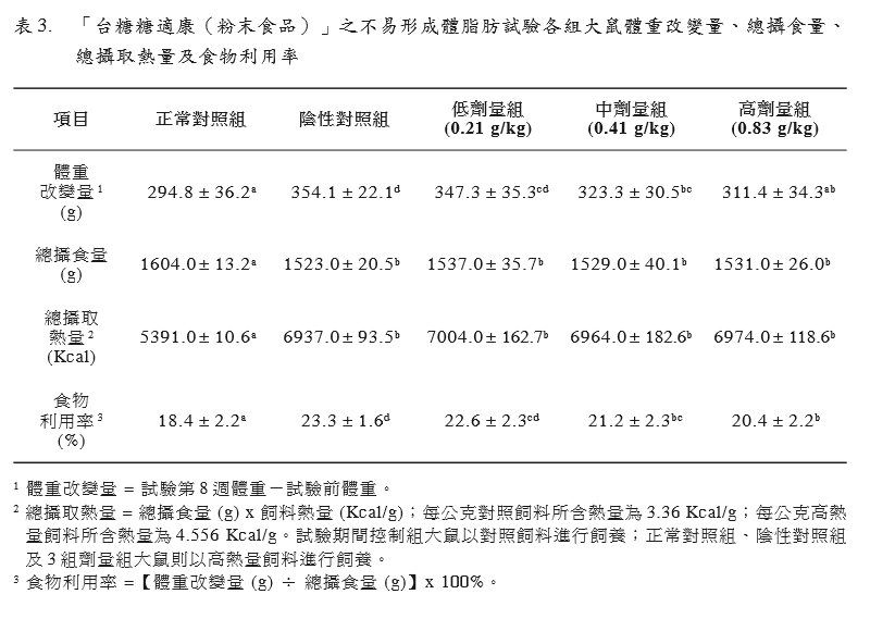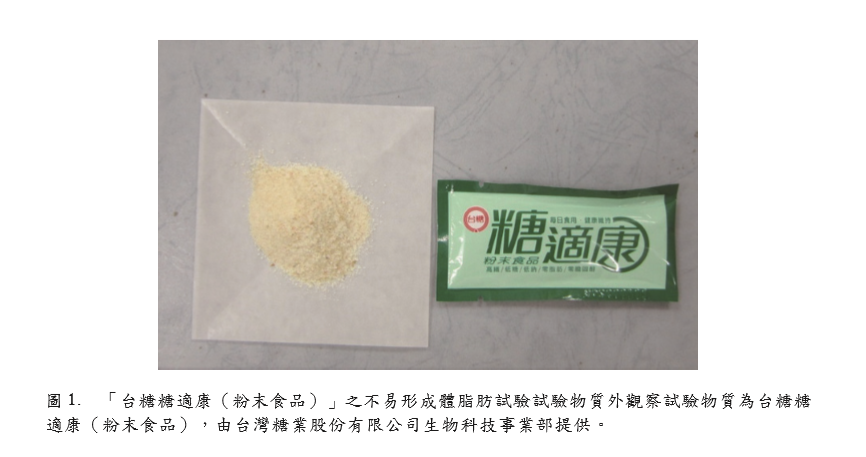 形。試驗期間同時投予試驗物質(zhì)「臺糖糖適 康(粉末食品)」,以評估其是否具有不易 形成體脂肪之功能。3 組劑量組試驗物質(zhì)投