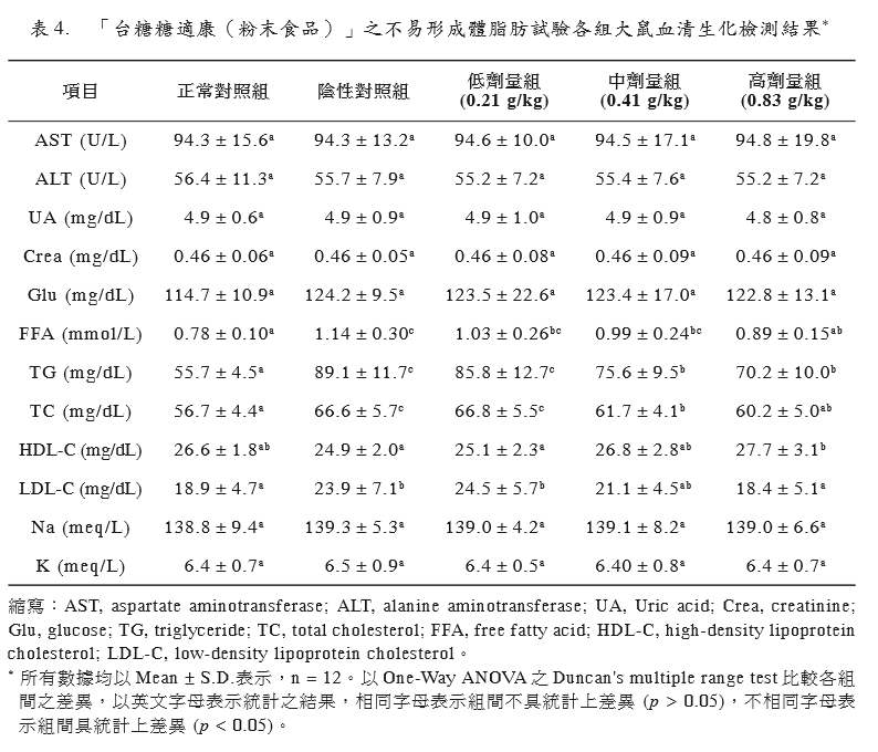 0.05)。大鼠之血清高密 度脂蛋白膽固醇濃度(HDL-C),高劑量與陰 性對照組相比較,則顯著增加(p < 0.05),增 加的幅度為10.1%。血清低密度脂蛋白膽固