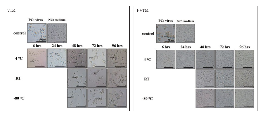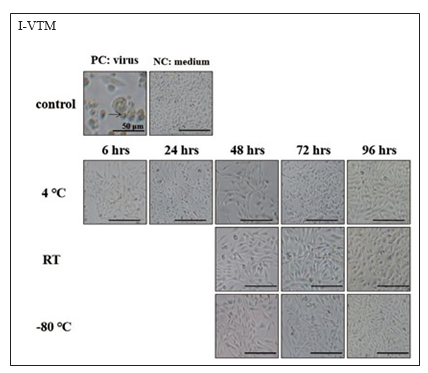 皆發(fā)現(xiàn) CPE:細(xì)胞呈現(xiàn)皺縮、變圓、出現(xiàn)空泡、凝聚、和脫落等現(xiàn)象(箭頭)。(B) I-VTM 的陰性控制組與實(shí)驗(yàn)組 細(xì)胞皆無 CPE,而陽性控制組則有 CPE。